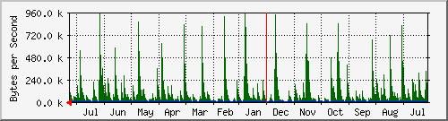 | Max In: | 954.7 kB/s (76.4%) | Average In: | 2121.0 B/s (0.2%) | Current In: | 1833.0 B/s (0.1%) | ||